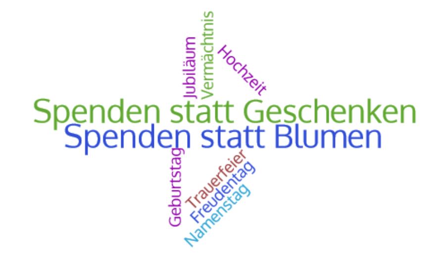 Bei Anlassspenden möchte der oder die SpenderIn lieber Geld für eine Spende an eine Organisation seiner/ihrer Wahl anstelle von Geschenken oder Blumen. Dafür gibt es folgende Möglichkeiten: